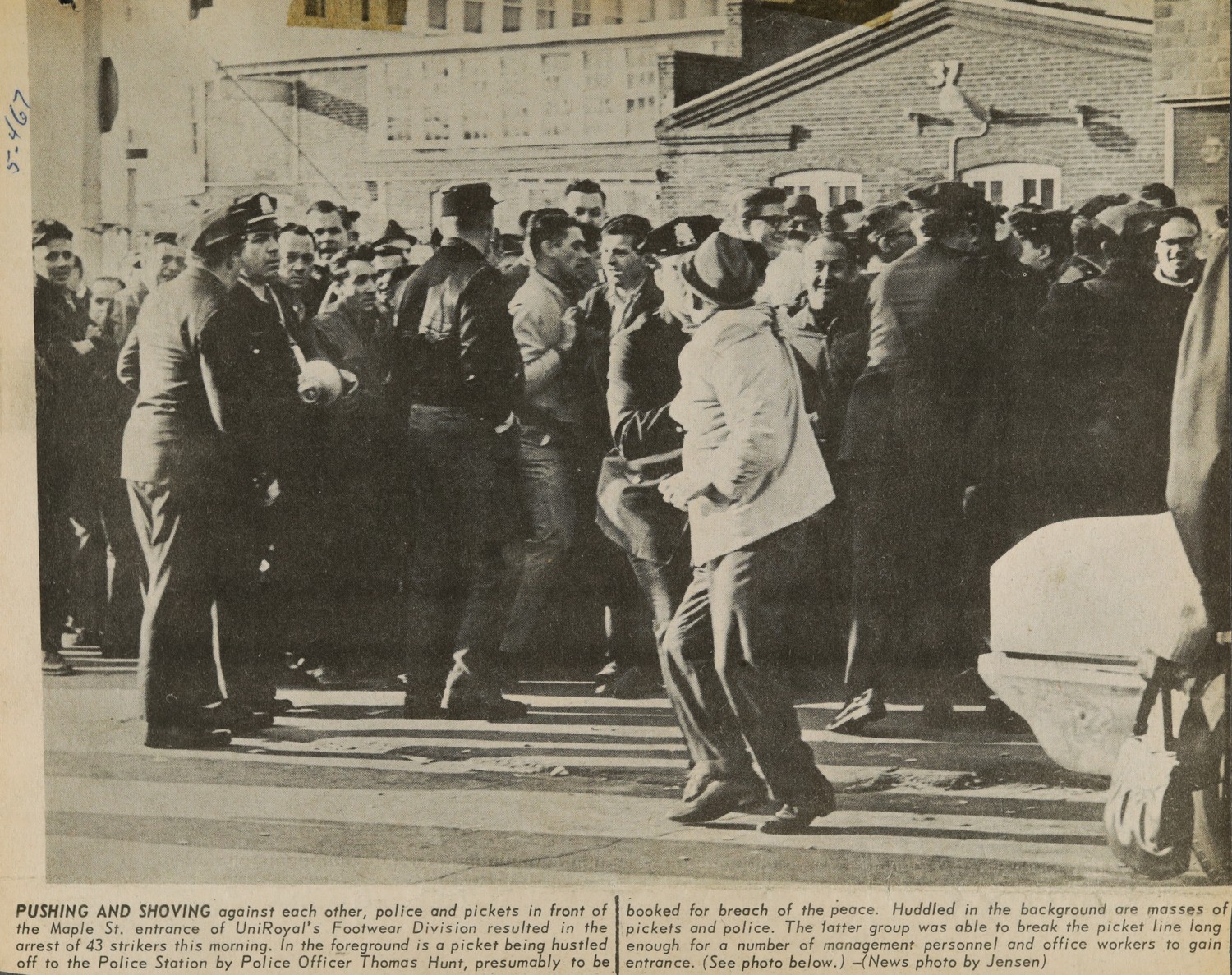 PUSHING AND SHOVING against each other, police and pickets in front of the Maple St. entrance of UniRoyal’s Footwear Division resulted in the arrest of 43 strikers this morning. In the foreground is a picket being hustled off to the Police Station by Police Officer Thomas Hunt, presumably to be booked for breach of the peace. Huddled in the background are masses of pickets and police. The latter group was able to break the picket line long enough for a number of management personnel and office workers to gain entrance. (See photo below.) —(News photo by Jensen)