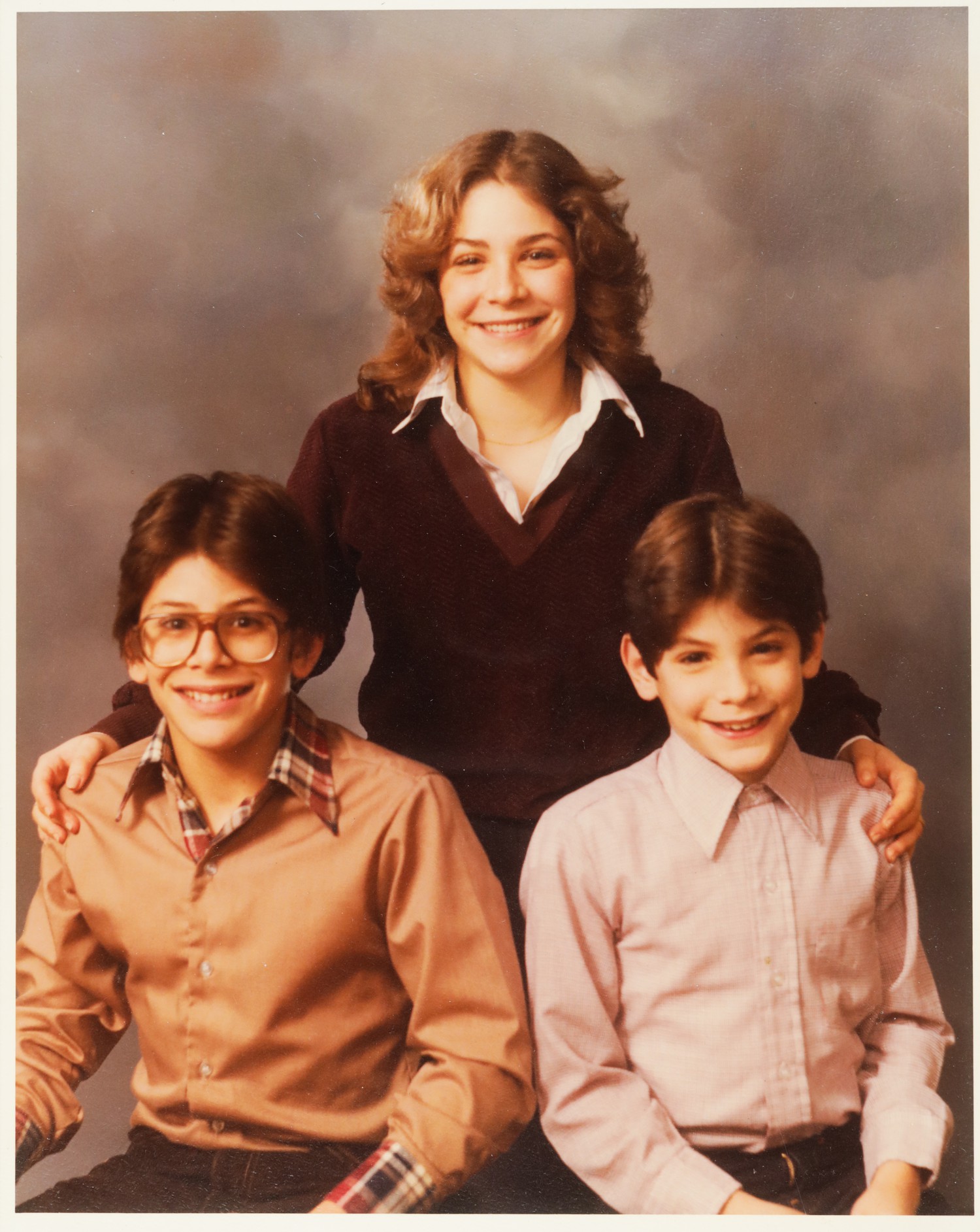 This image appears to be a vintage family portrait photograph from approximately the 1980s, based on the styling, clothing, and photo quality. It shows three young people – a teenage girl standing in the back wearing a burgundy/maroon V-neck sweater over a white collared shirt, and two younger boys seated in front of her. The boy on the left wears large glasses and a tan/beige button-up shirt with a plaid collar visible underneath, while the boy on the right wears a light purple/lavender button-up shirt.