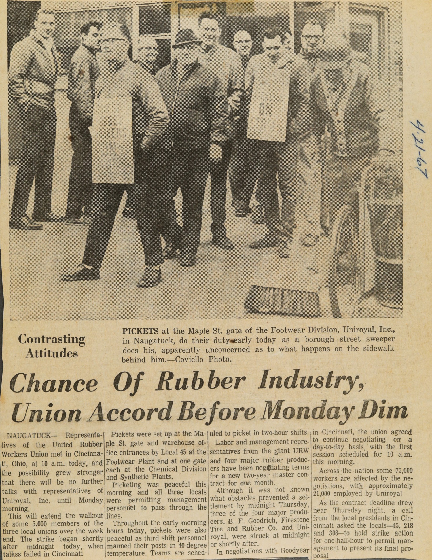PICKETS at the Maple St. gate of the Footwear Division, Uniroyal, Inc., in Naugatuck, do their duty early today as a borough street sweeper does his, apparently unconcerned as to what happens on the sidewalk behind him.—Coviello Photo.