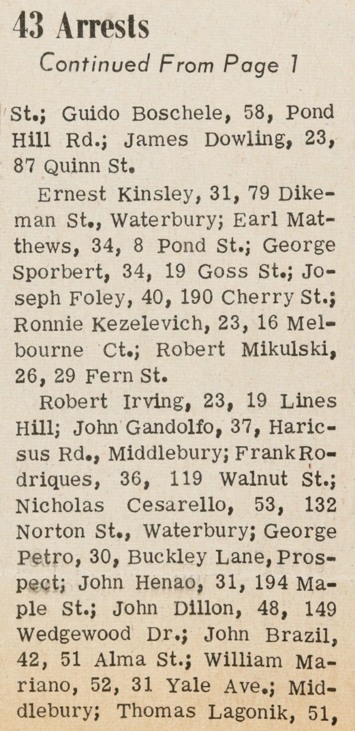 Robert Irving, 23, 19 Lines Hill; John Gandolfo, 37, Haricsus Rd., Middlebury; Frank Rodriques, 36, 119 Walnut St.; Nicholas Cesarello, 53, 132 Norton St., Waterbury; George Petro, 30, Buckley Lane, Prospect; John Henao, 31, 194 Maple St.; John Dillon, 48, 149 Wedgewood Dr.; John Brazil, 42, 51 Alma St.; William Mariano, 52, 31 Yale Ave.; Middlebury; Thomas Lagonik, 51,