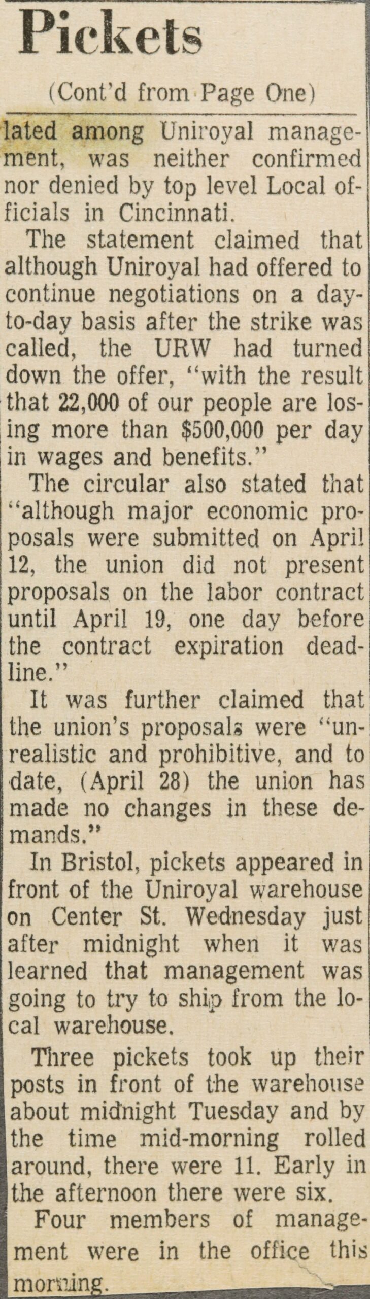 Pickets were set up at the Maple St. gate and warehouse office entrances by Local 45 at the Footwear Plant and at one gate each at the Chemical Division and Synthetic Plants.