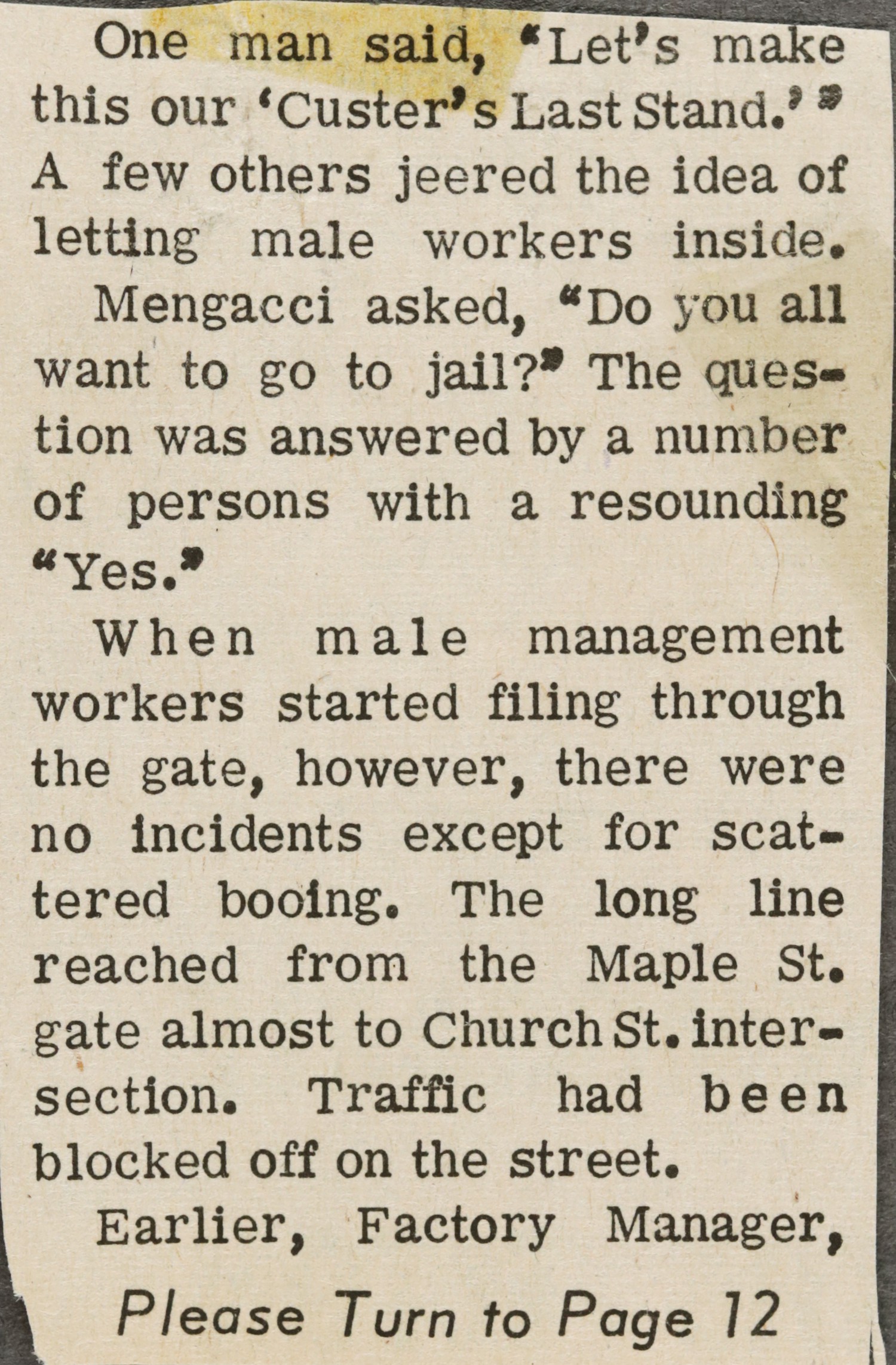 Police Chief Frank Mariano reported this morning that Captain Joseph Summa is in charge of the men on special strike assignments. Summa reported he has posted one policeman at each gate of the striking plants with a total of 10 men pressed into extra duty.