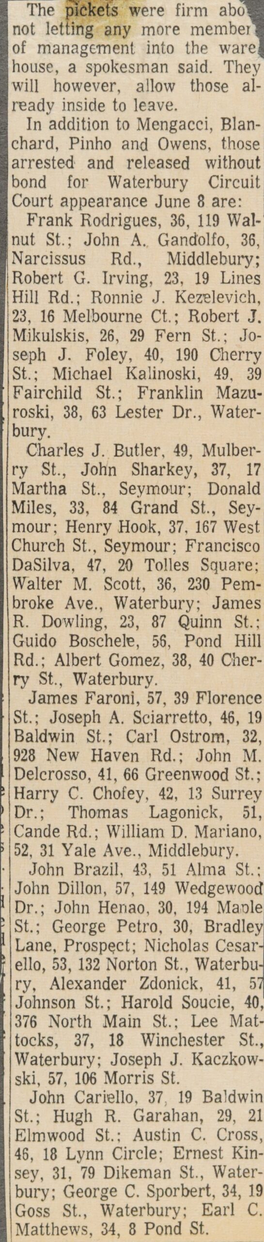 Also: Frank Rodrigues, 36, 119 Walnut St., Naugatuck; John A. Gandolfo, 36, Narcissus Road, Middlebury; Robert G. Irving, 23, 19 Lines Hill Road; Ronnie J. Kezelevich, 23, 16 Melbourne Court; Robert J. Mikulsis, 26, 29 Fern St.; Joseph J. Foley, 40, 199 Cherry St.; Michael Kalinoski, 49, 39 Fairchild St.; Franklin Mazuroski, 38, 63 Lester Drive, and Charles J. Butler, 49, Mulberry Street, all of Naugatuck.