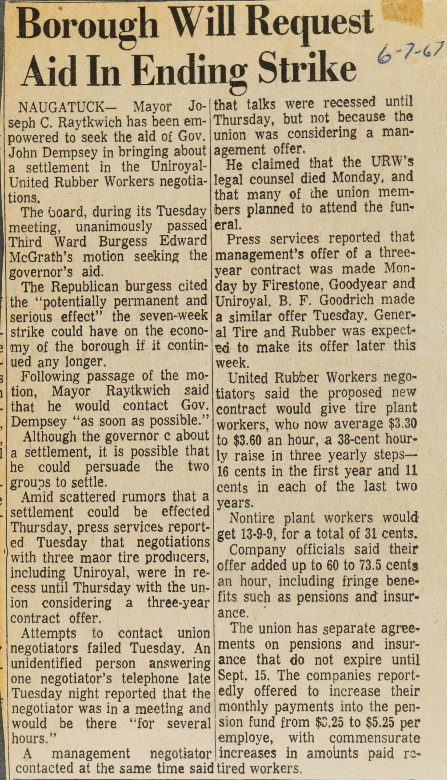 NAUGATUCK— Mayor Joseph C. Raytkwich has been empowered to seek the aid of Gov. John Dempsey in bringing about a settlement in the Uniroyal-United Rubber Workers negotiations.