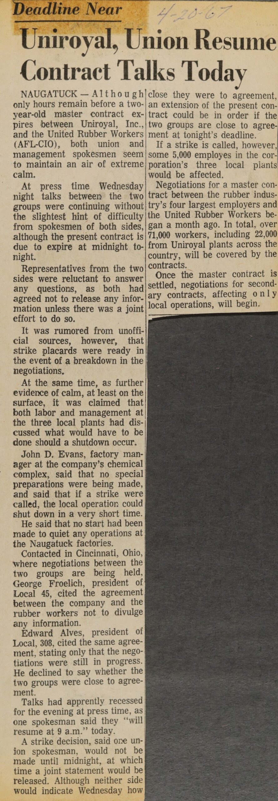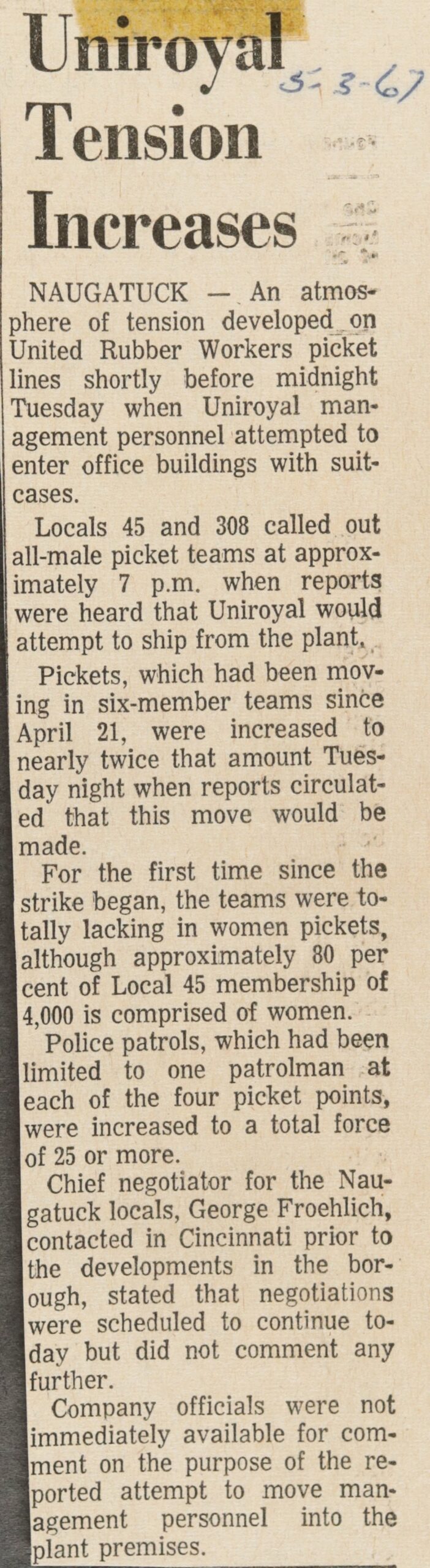 The presidents of the three locals, George Froehlich from Local 45, Joseph Rzeszutek from Local 218 and Edward Alves from Local 308, returned from Cincinnati over the weekend for a breather and a chance to talk to the union members.