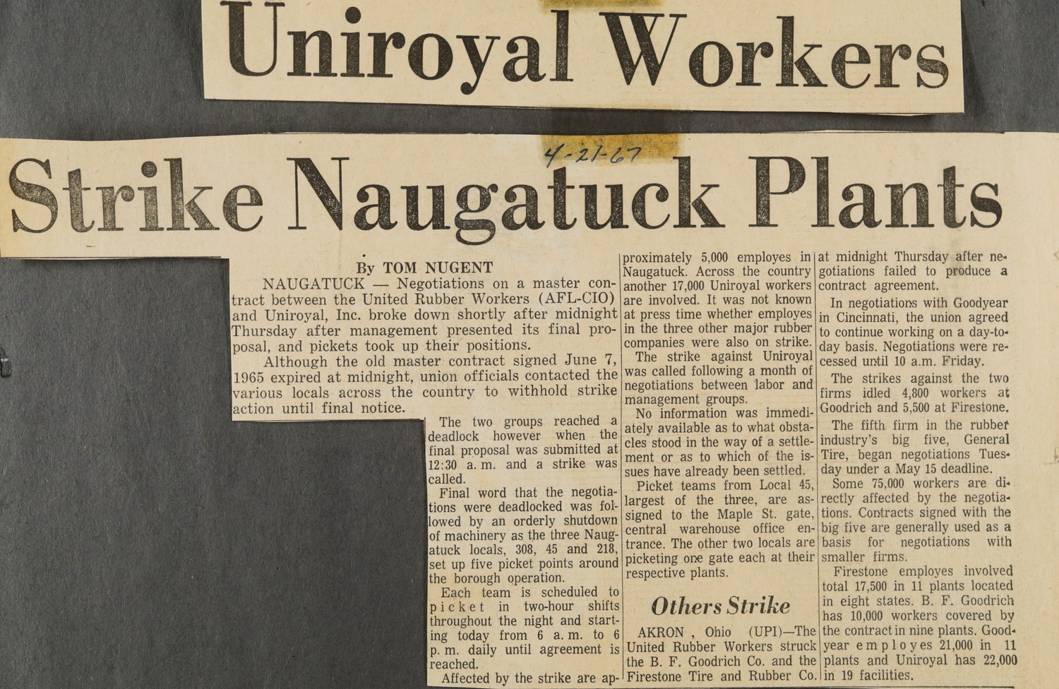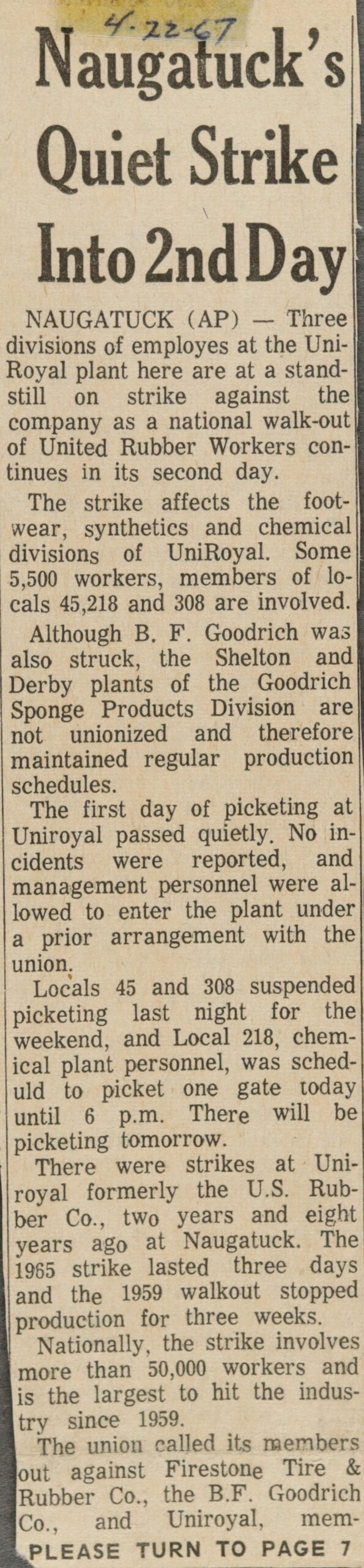 Besides the approximately 5,000 workers at the borough Uniroyal plants, some 16,000 other Uniroyal employes connected with the URW are on strike, as are 17,585 at Firestone and 10,930 at B. F. Goodrich.