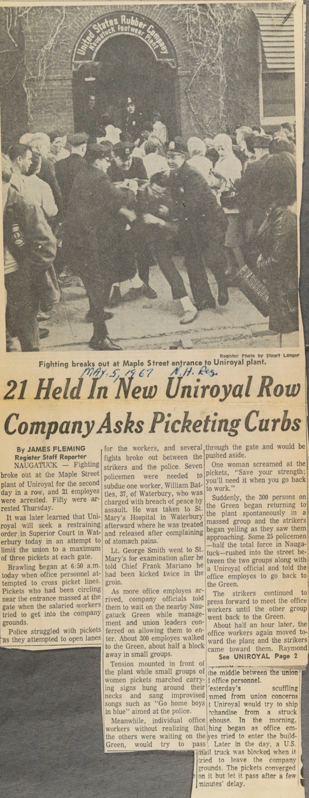 Police struggled with pickets as they attempted to open lanes for the workers, and several fights broke out between the strikers and the police. Seven policemen were needed to subdue one worker, William Battles, 37, of Waterbury, who was charged with breach of peace by assault. He was taken to St. Mary’s Hospital in Waterbury afterward where he was treated and released after complaining of stomach pains.