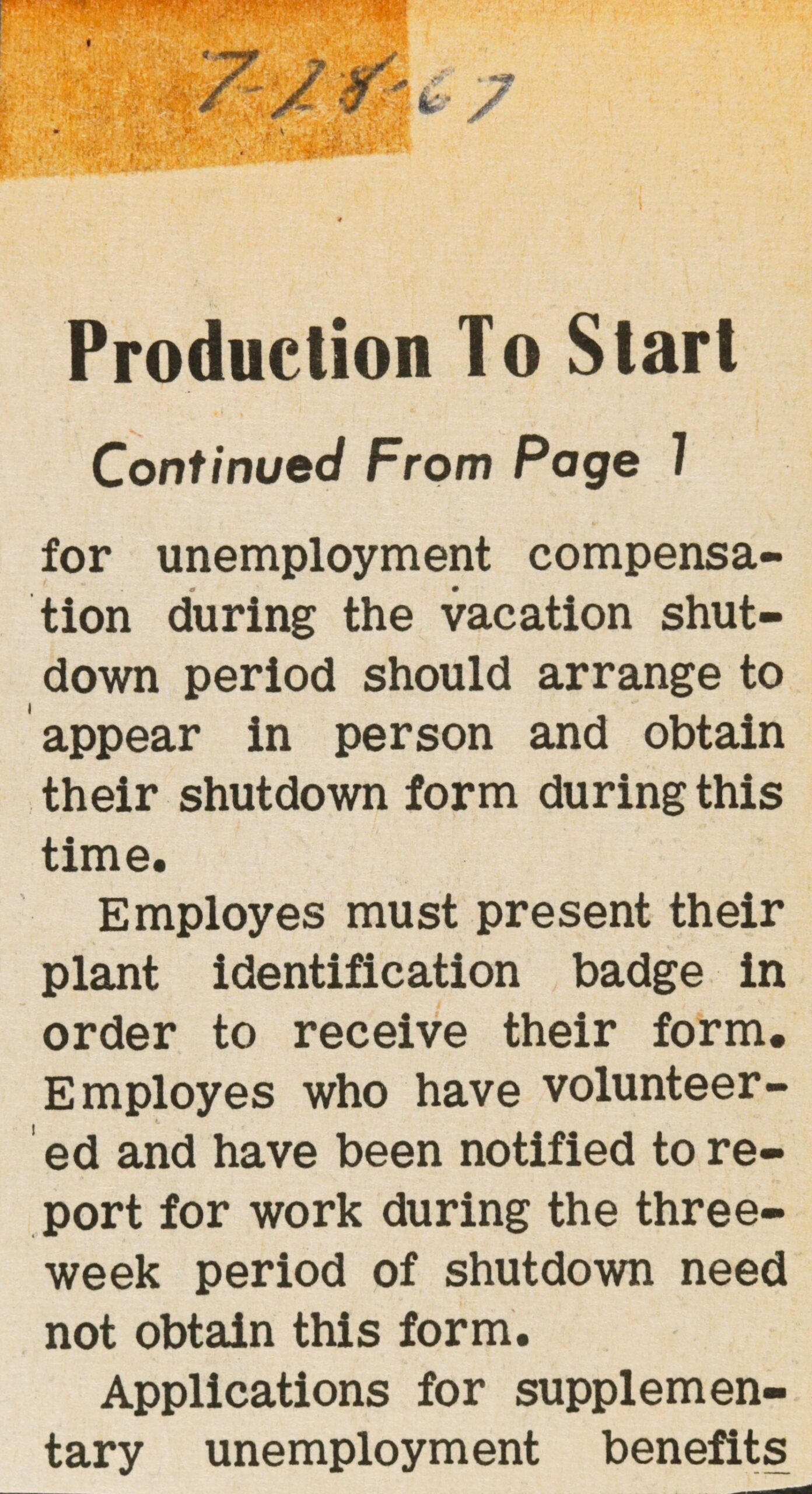 Employes must present their plant identification badge in order to receive their form. Employes who have volunteered and have been notified to report for work during the three-week period of shutdown need not obtain this form.