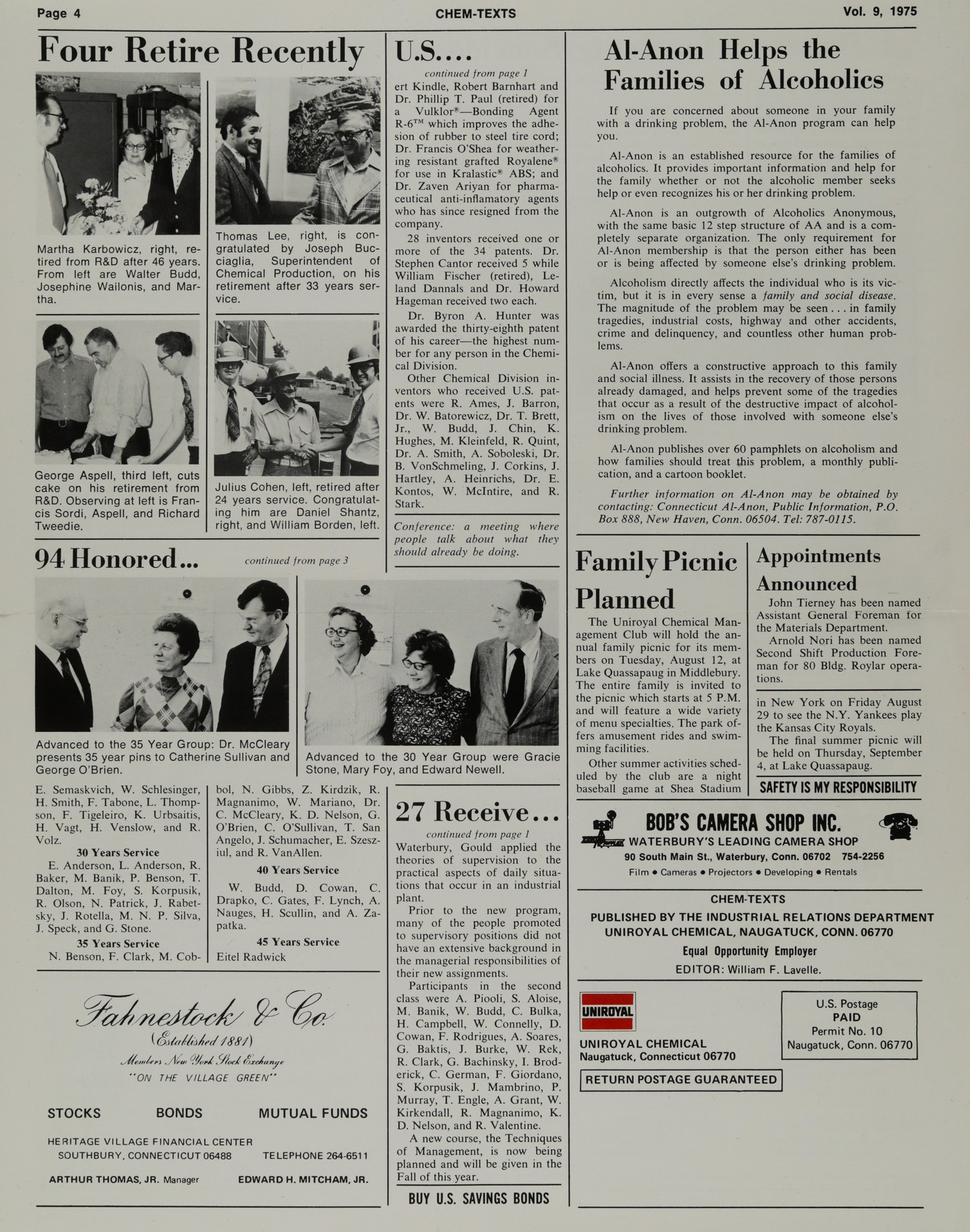 This year’s committee helped to make the tour-picnic even better than last year’s. The members were E. Johnson, Factory Manager; C. Antrum, S. Bond, R. Breton, W. Broden, M. Cobbol, L. Coscia, R. Douglas, H. Francolini, J. Labrecque, J. Linn, S. Mazur, H. Mullen, R. McDermott, J. Prior, R. Shortt, T. Sills, D. Shantz, R. Shipman and J. Tierney. URW Local 218 President, J. Rzeszutek and W. Lavelle were Co-Chairmen for the event.