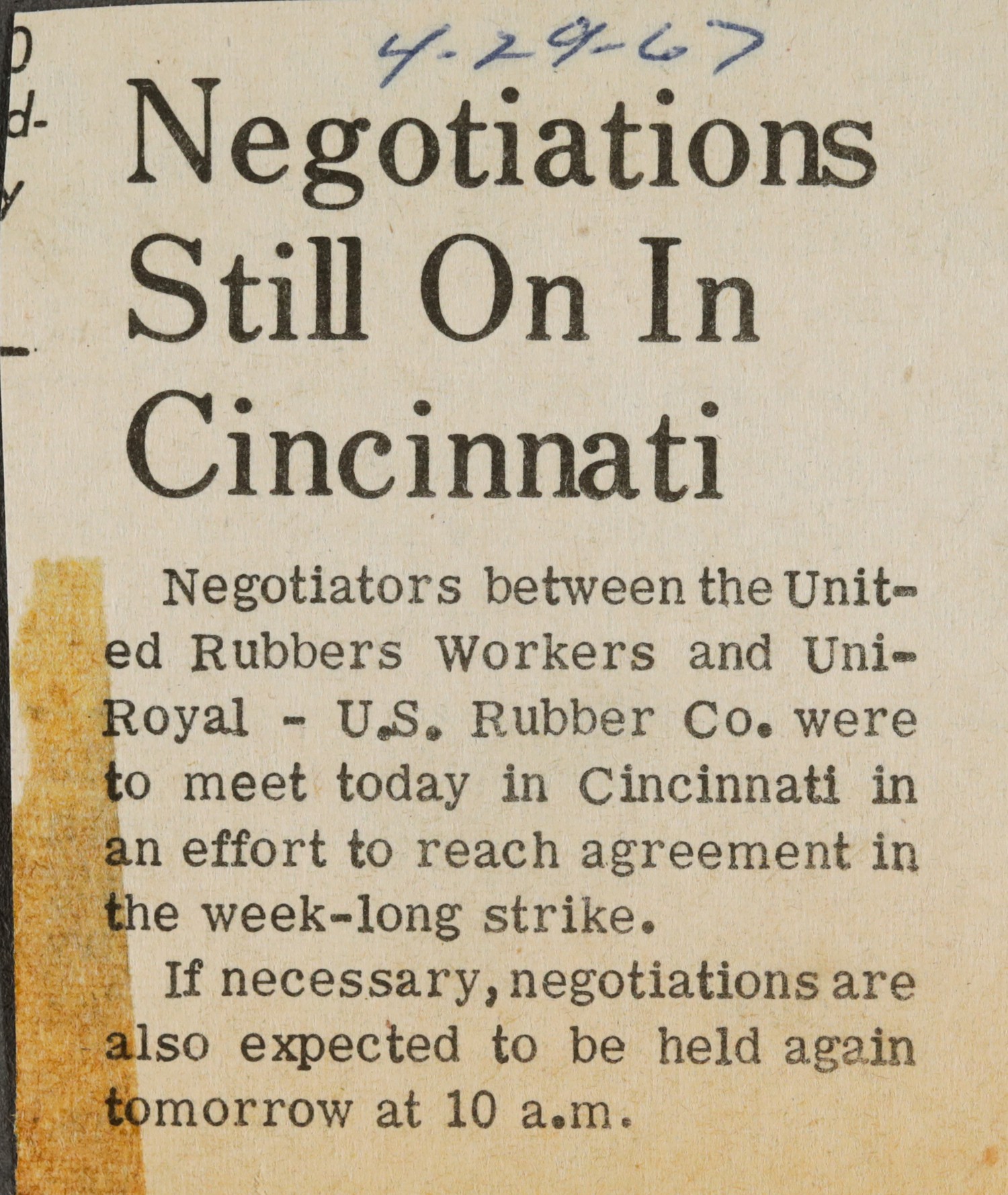 Negotiations are presently being held in three Ohio cities. UniRoyal and Goodyear are negotiating in Cincinnati, Firestone and General Tire in another city with Goodrich in the third location.