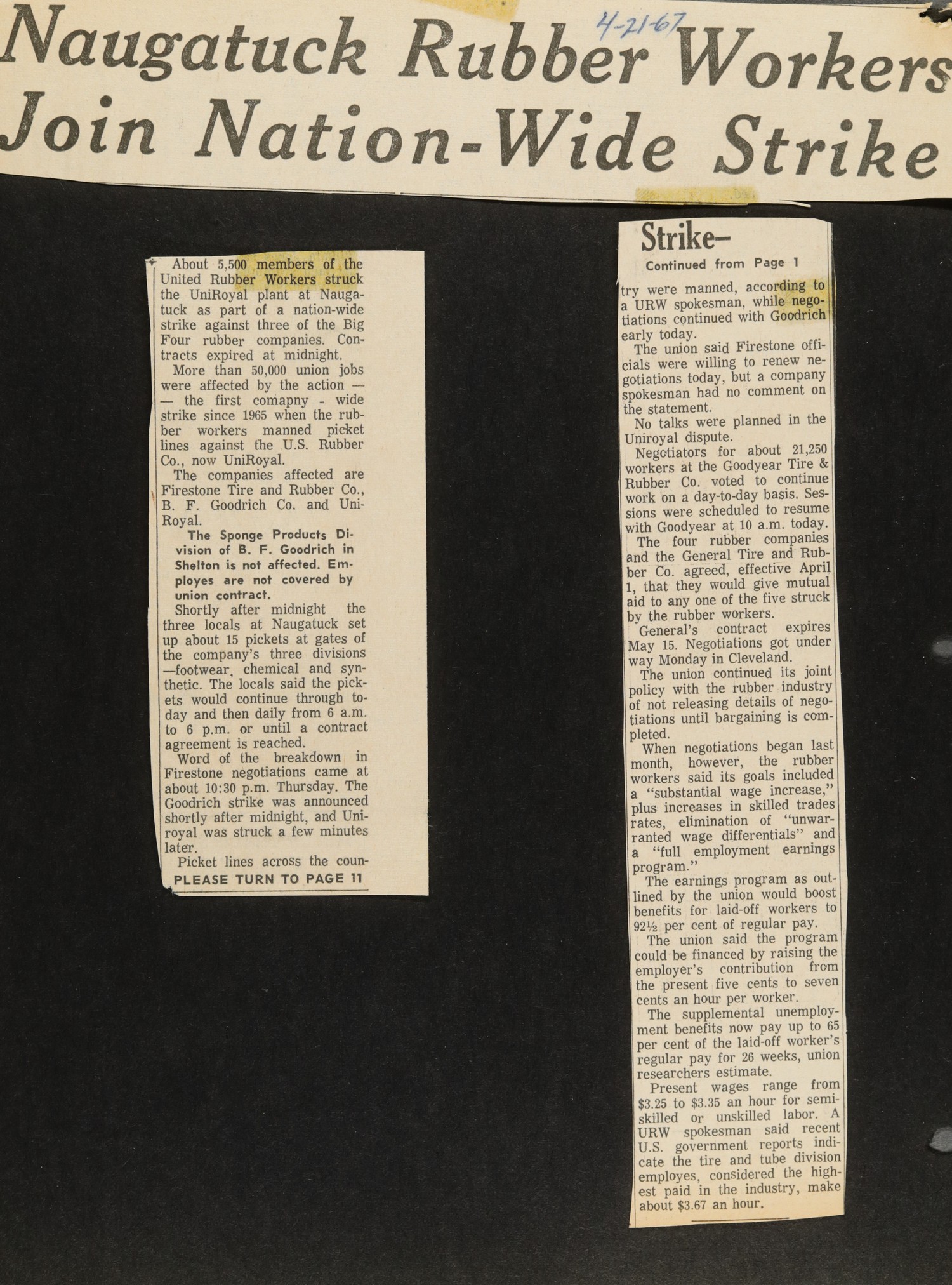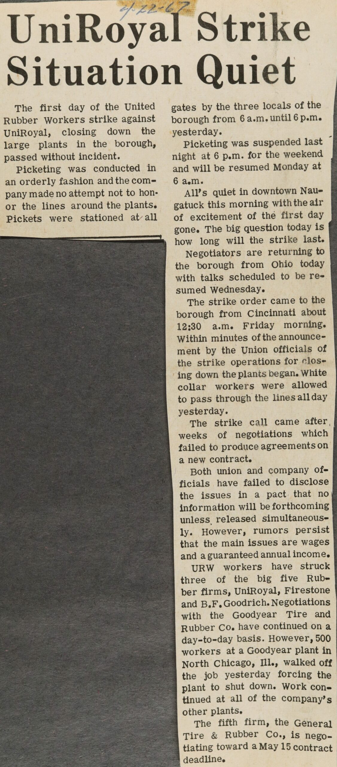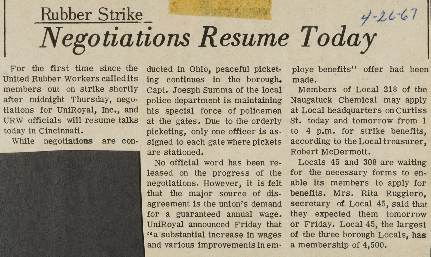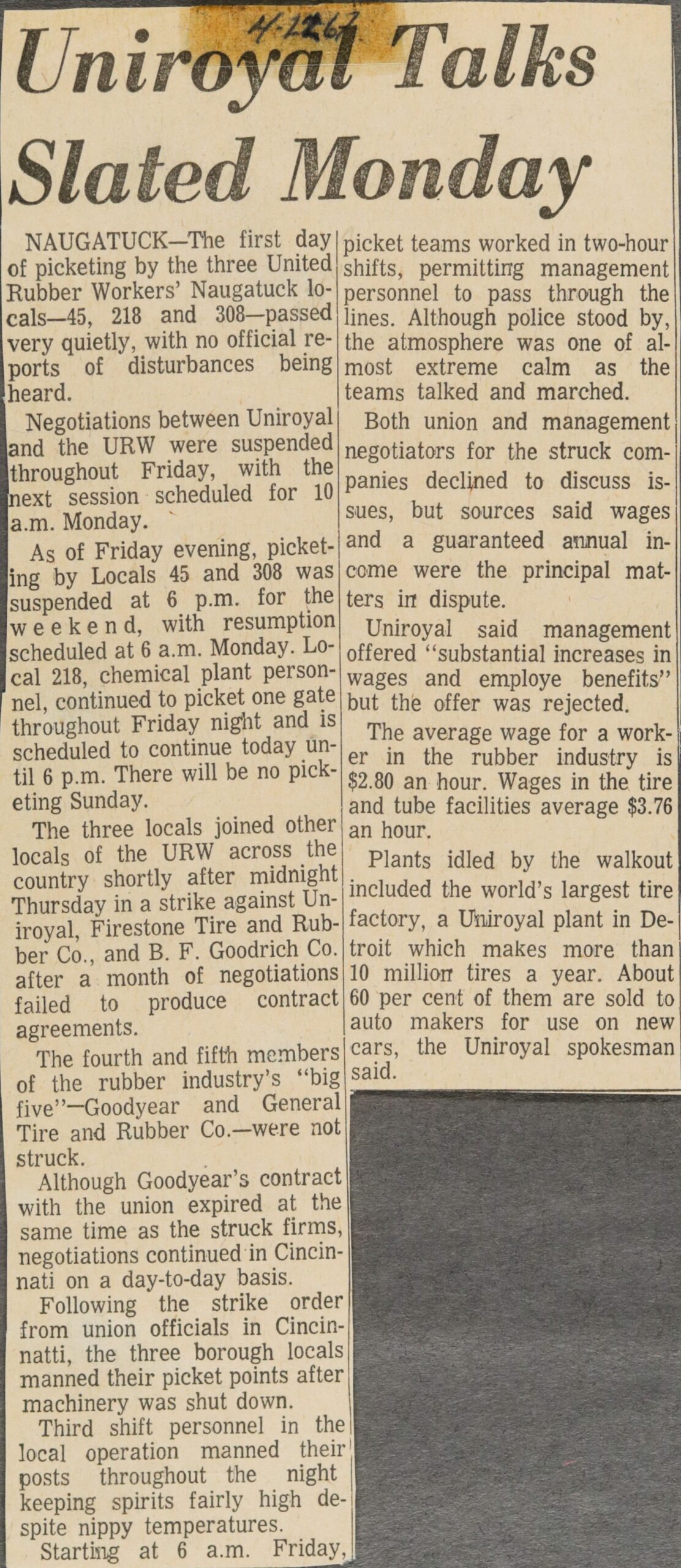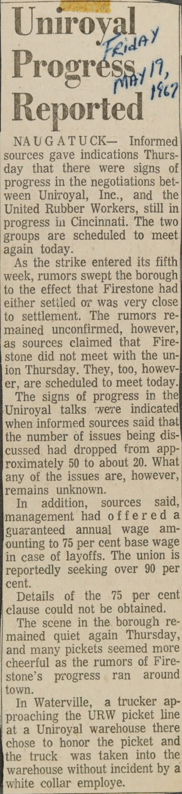 Striking United Rubber Workers employed at the UniRoyal plants in Naugatuck are anxiously waiting news from Cincinnati. With two of the “Big Five” rubber companies settling their differences, local residents are hopeful that a settlement with UniRoyal will come next.