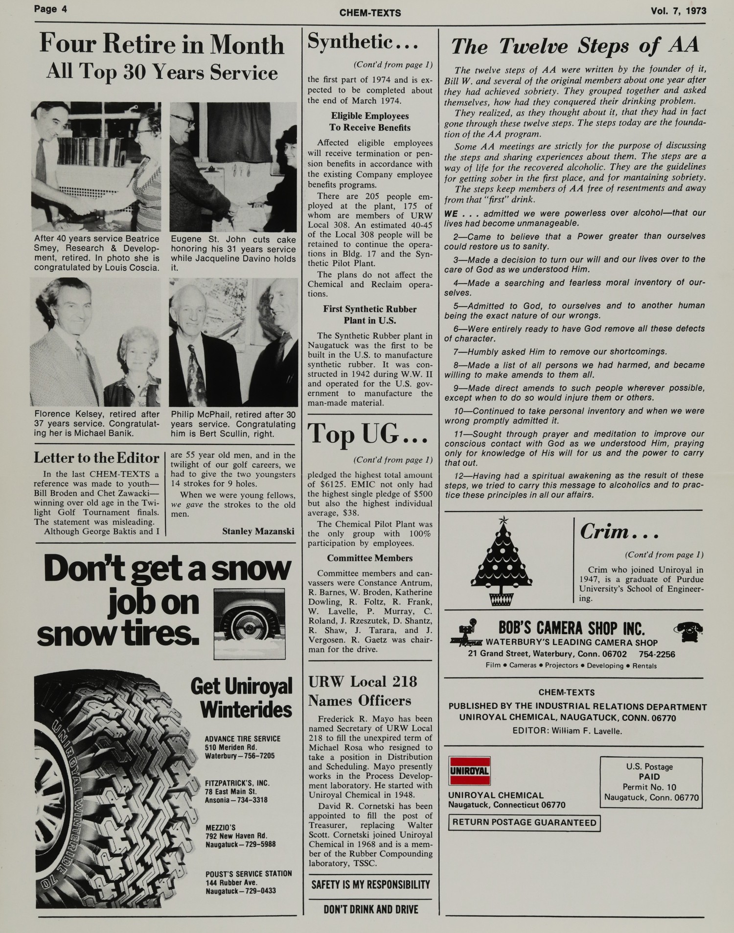 The Uniroyal Chemical plant has a firm commitment to offer equal opportunity to all employees. It is the policy of the plant’s management to support and implement this commitment continually.
